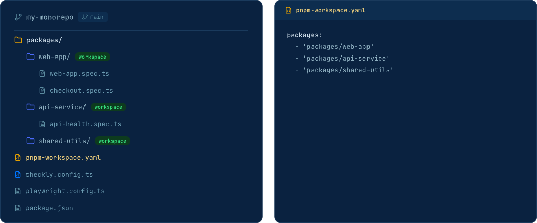 No extra configuration needed. Point Checkly at your suite, and it resolves the dependency tree from your workspace root.