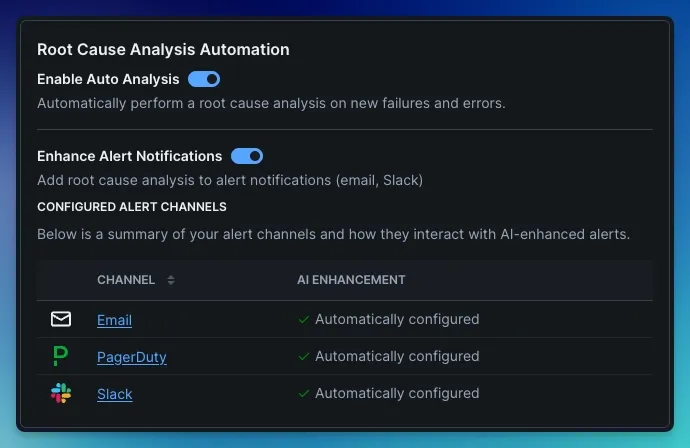 To enable this new feature, just head over to the Rocky AI settings page and flip two toggles. Now, on each new failure, Rocky AI will automatically kick off a Root Cause Analysis (RCA) and add the results to your email, Slack message, Teams message etc.