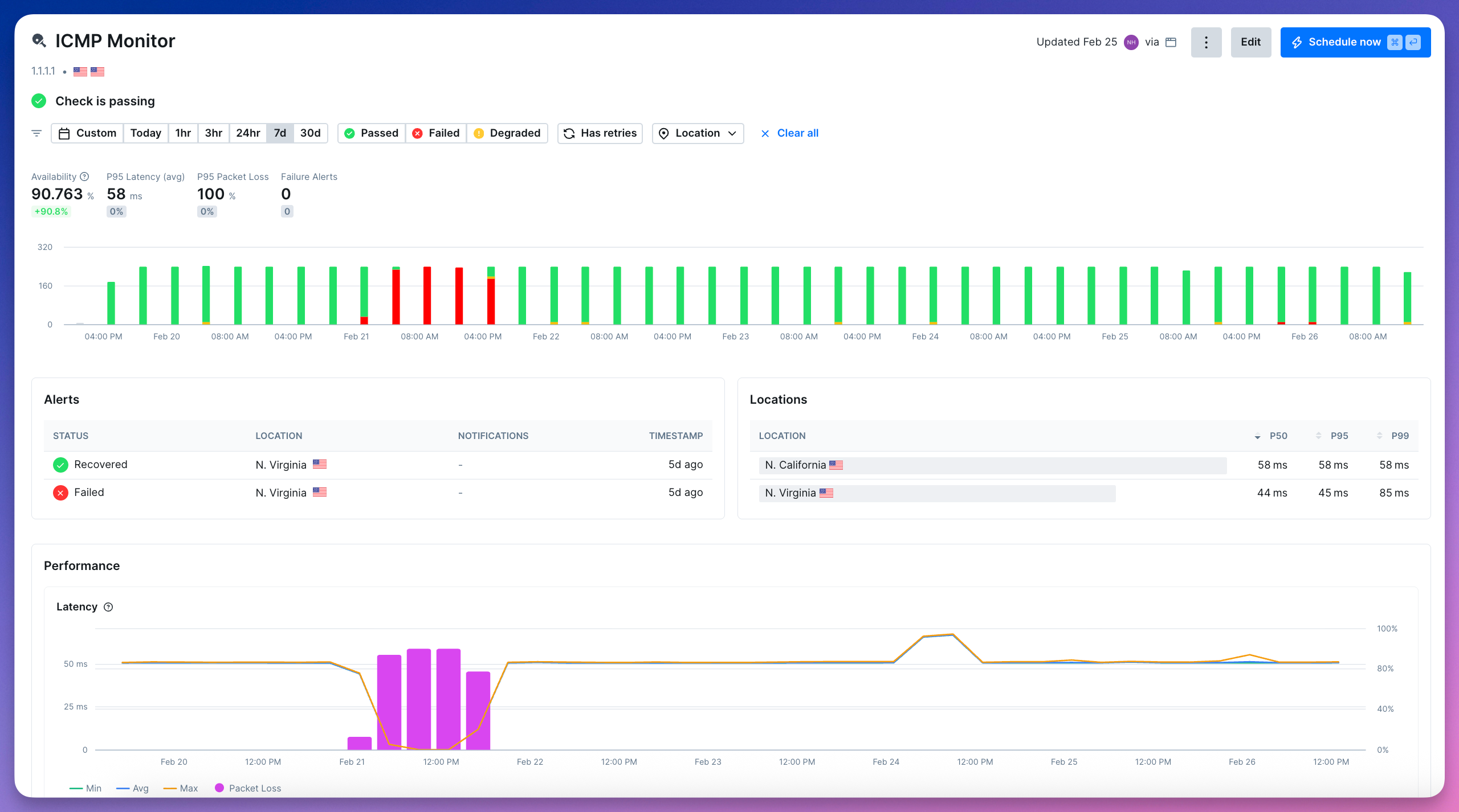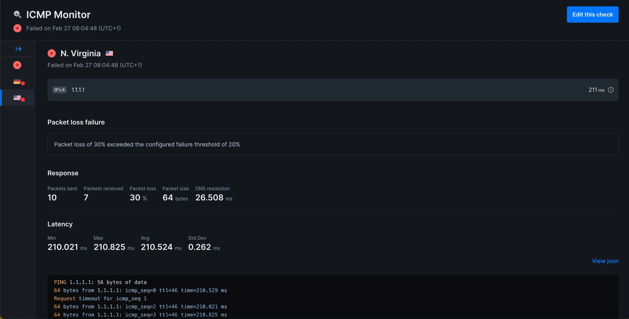 ICMP monitors continuously ping your hosts to measure reachability, latency, and packet loss across regions, so you can spot connectivity issues before they impact your users.