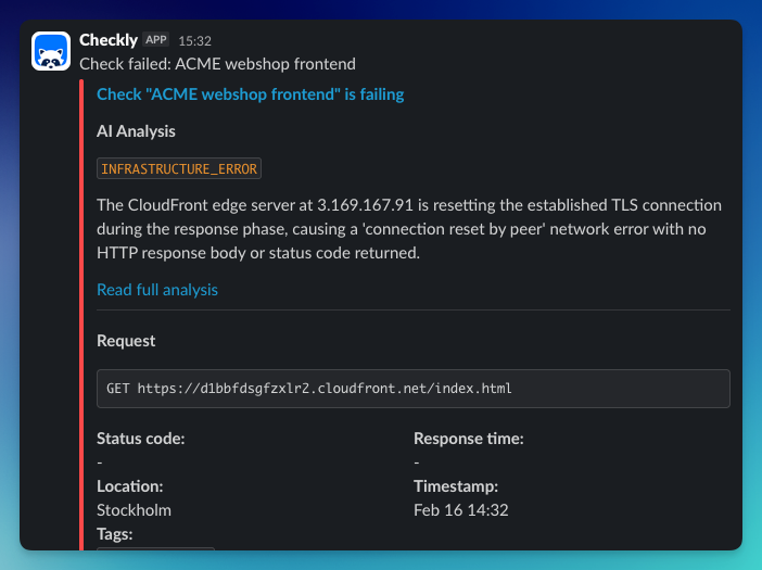 Rocky AI — Checkly’s AI agent — automatically analyzes, categorizes, and summarizes failures from your monitors and synthetic checks.