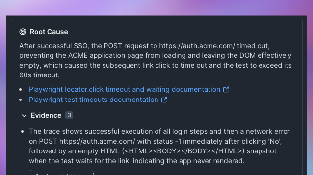 Rocky AI RCA breaks down the failure into logical chunks, starting from the user perspective, via steps in your test to the underlying root cause.