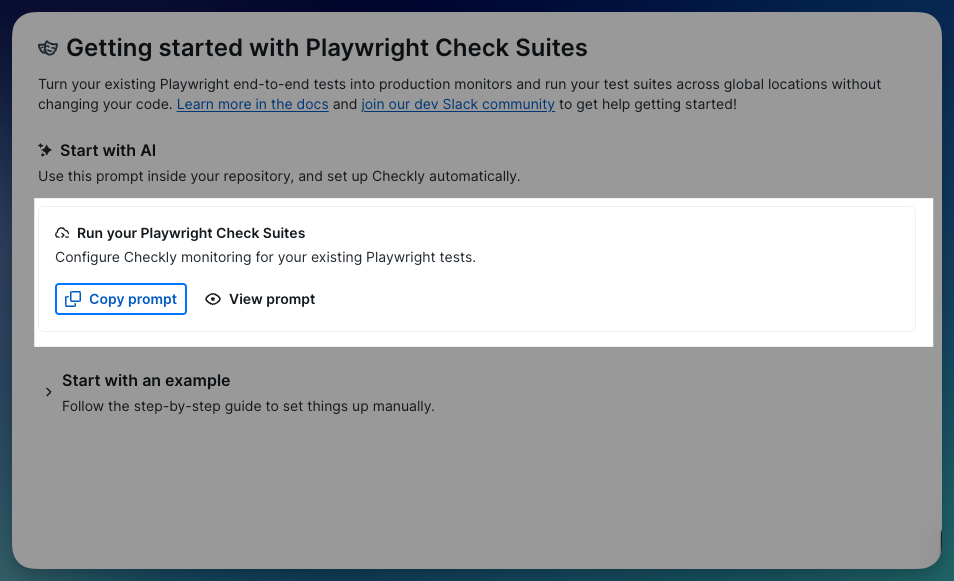 👉 Install the Checkly skill using npx checkly skills install to get going! (available since v7.7.0, replaces the previous npx skills add command)
