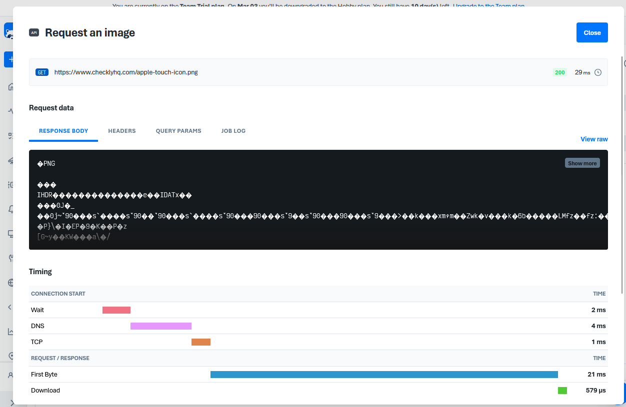 If you create an API check that returns an image, the request completes perfectly fine, but the response body itself is displayed in binary format, rather than the image itself: